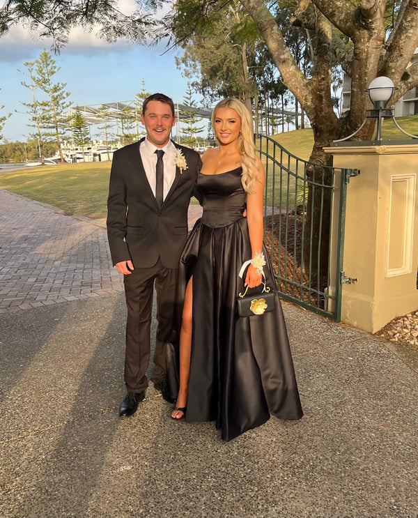 She IS THE moment! This structured black corset gown is the epitome of timeless sophistication. Featuring everyones favourite dropped bodice with a scooped neckline, a dramatic high split, and a full A-line skirt that flows with every step — it's bold, elegant, and made to turn heads. Perfect for formal events, black tie nights, or any moment you want to feel powerful and unforgettable.