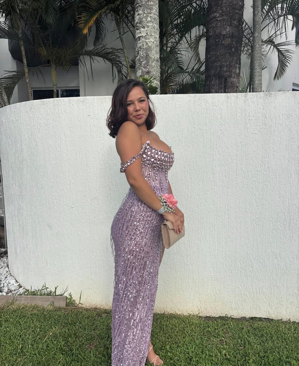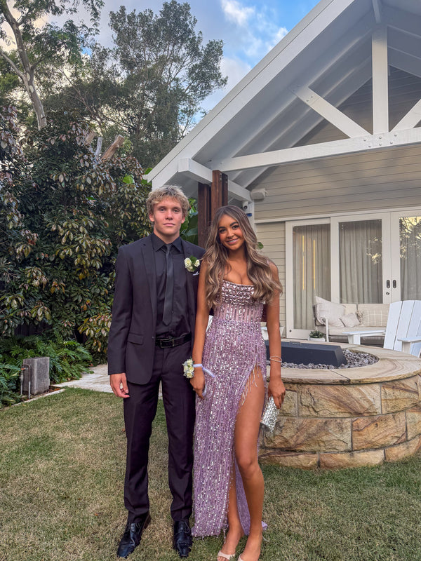 The gown to absolutely steal the show! Delicate, individually hand sewn lilac and pink Swarovski crystals, glass stones and sequins throughout, providing incredible sparkle. Straight across neckline with pink 3D crystals that aline the bodice. The Blossom gown features a high leg split and corset style back for adjustability.