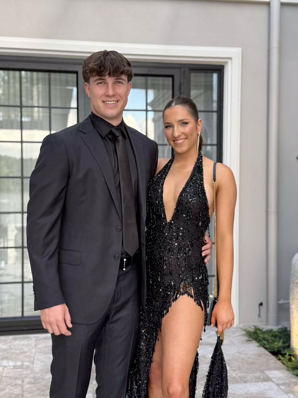 The ultimate wow gown dripping in black crystals! Incredible statement plunge neckline and halter style, with stunning backless look. Featuring a striking high leg split that's hand-detailed with overhanging crystal tassle trims, this dress is unmatched. We're thrilled to have this incredible gown. The new 'it' dress of 2024.