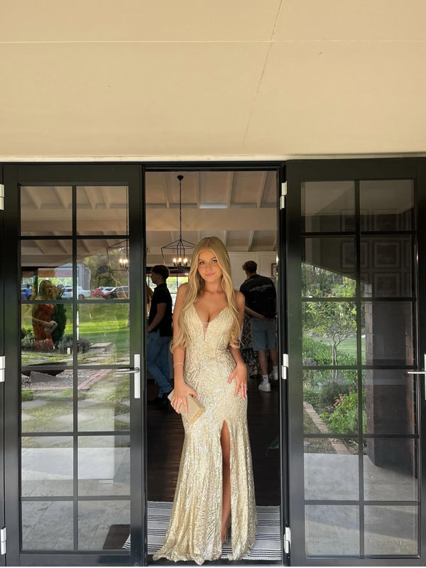 Out shine them all in this head-to-toe gold shimmering gown. A pale gold overlay of glitter and sequins with a molded bodice combine to give a figure hugging fit. Leg split and mermaid silhouette. The stiffened and scalloped hem gives a fluted effect through the train. A dreamy golden girl, statement dress.