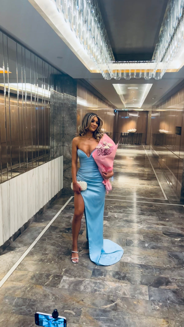 The most perfect baby blue, high quality satin. The intricate pleats and corset-style strapless bodice gives this gown a structured elegance. High side leg split and dramatic train. Ultimate elegance.