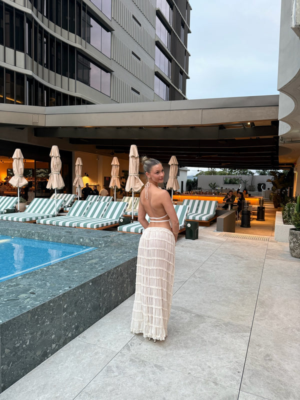 The Juliette Set combines vintage charm and versatility, featuring a ruched maxi skirt with piped lace and a matching halter top with adjustable ties and satin straps. In a elegant ivory with a sheer finish, this romantic set is perfect for any occasion.