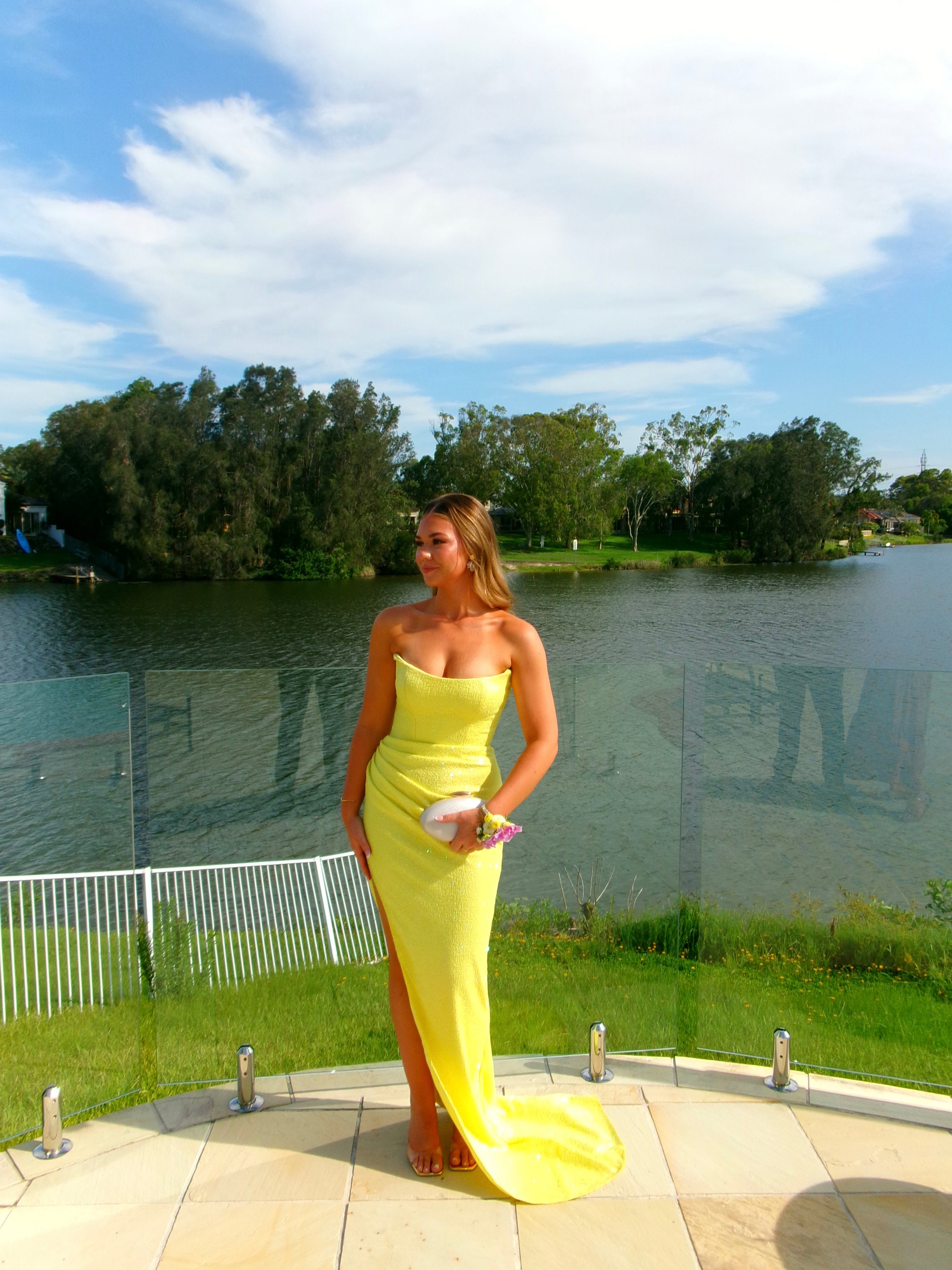 The Lana Gown features a radiant yellow strapless design with shimmering fabric. Its fitted bodice and draped waist detail create a flattering silhouette. A stunning high leg slit adds a touch of allure.