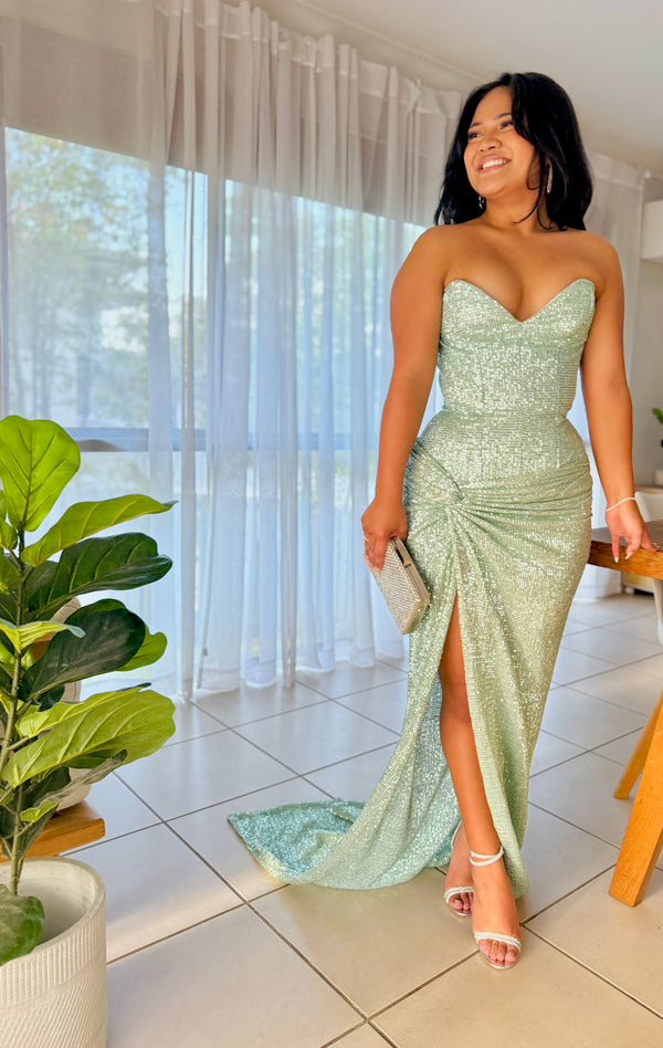 Outshine them all in this absolutely stunning strapless gown in silvery aqua tones. Corseted bodice with adjustable back detail and separate skirt with long, draped train. Sweetheart neckline gives the most flattering fit. Gathered knot feature at the hip accentuates the dramatic high leg split. Totally extra and we love this pretty green blue colour.