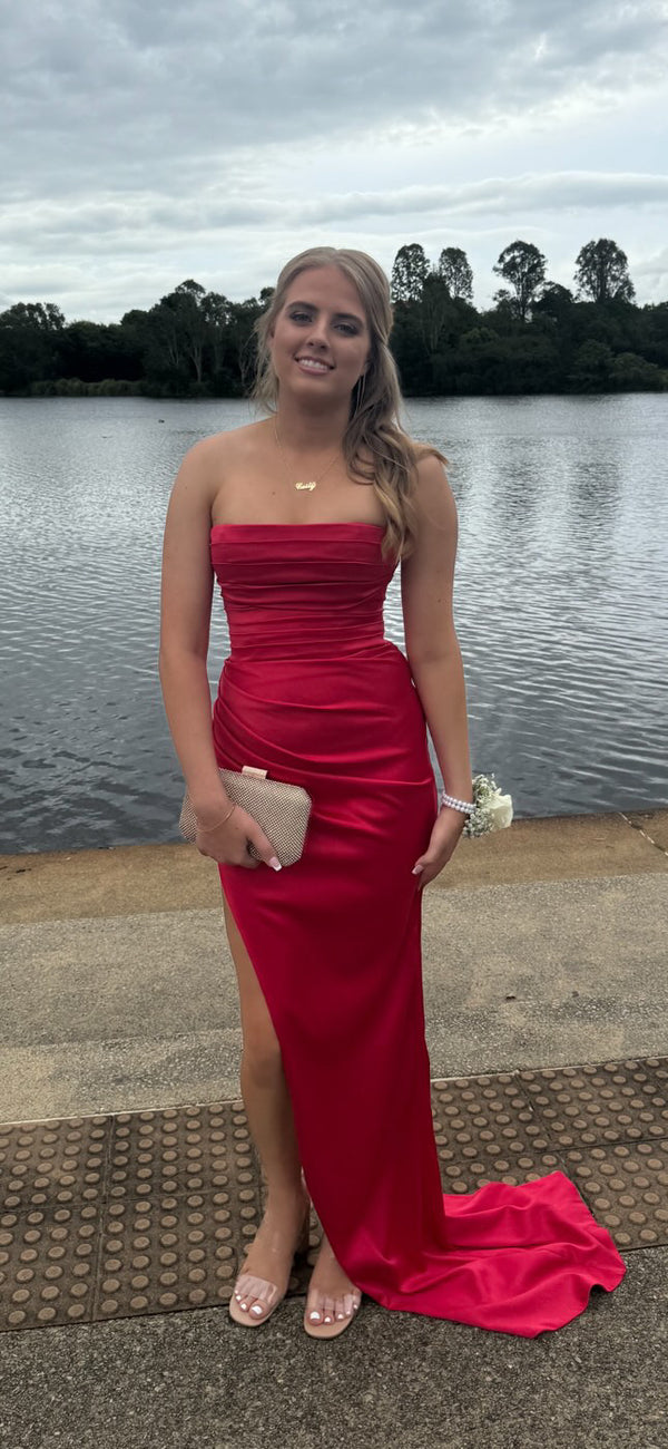 Taking the classic strapless to new level, the Odette Gown has the most beautifully pleated bodice with a straight neckline to sculpt and enhance. It's incredibly elegant with that signature LS column silhouette and ruched skirt that sweeps into a high leg split. Corset style bodice to cinch the waist.