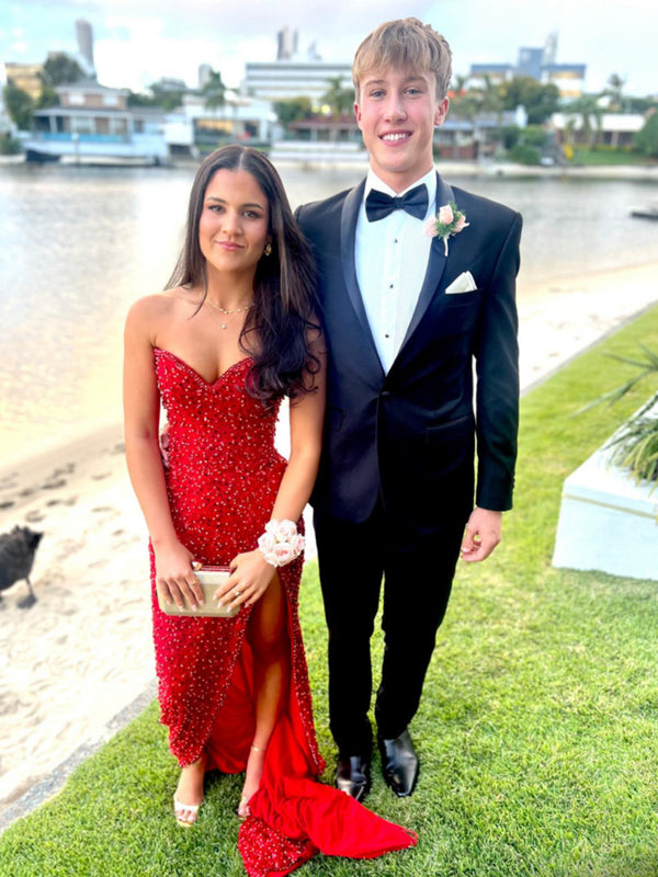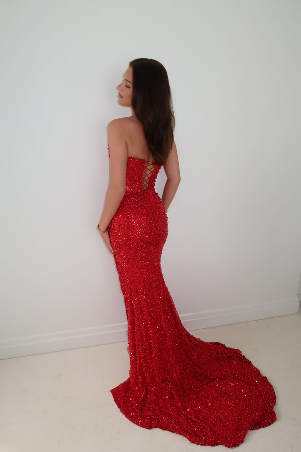 The centrepiece of our Albina Dyla collection, the Opulence Gown is an absolutely exquisite couture gown. French beaded tulle is embellished with Swarovski crystals, diamantes and sequins. The strapless corset style bodice perfectly cinches the waist. Sleek column silhouette with full train. Pretty crystals detail the sweetheart neckline, along the leg split and edge of the train. Red carpet desirability by Europe's finest couturiers. statement