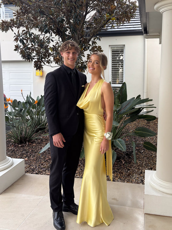 The new 'IT GIRL' dress is here. This yellow silk gown combines a draped halter neckline with a sleek open back and tie detail. The soft, flowing fabric creates a clean, elegant look, making it perfect for formal events. Simple yet refined, this dress offers timeless sophistication.