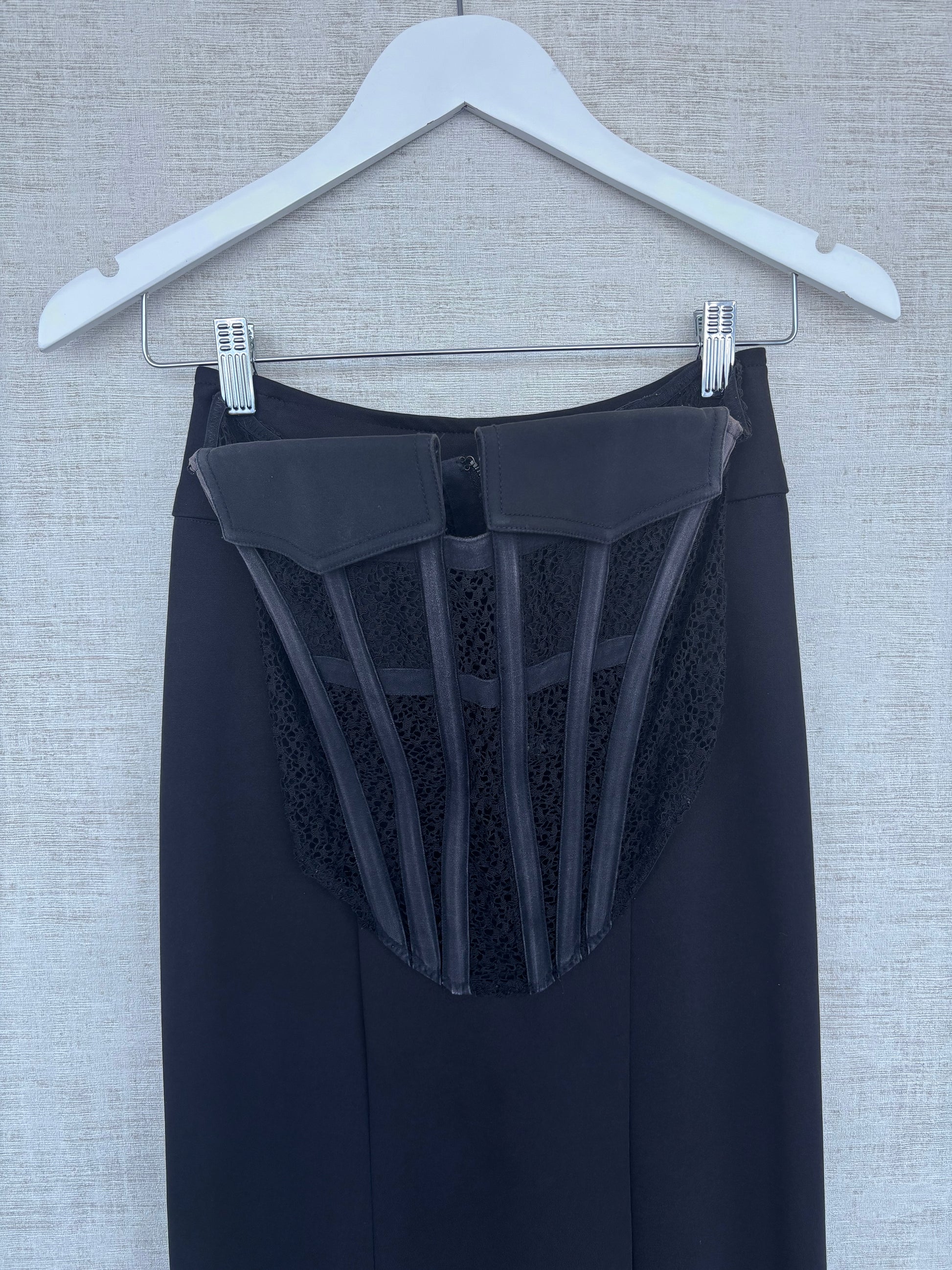 The corset blowing up Instagram! Teamed with our custom made mermaid skirt for a strapless gown appearance. The corset features pocket detail, boning for support and stretch French webbed lace for an unbelievable fit. Elegant and edgy.