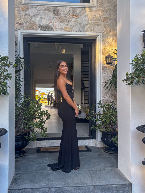 Redefined elegance. Black glass crystals adorn the plunge neckline of this incredible statement gown. Mesh inlet and an adjustable corseted lace up back, completely shape and cinch the bust line. Premium stretch jersey with an accentuated mermaid silhouette. Form fitting and next level elegance.