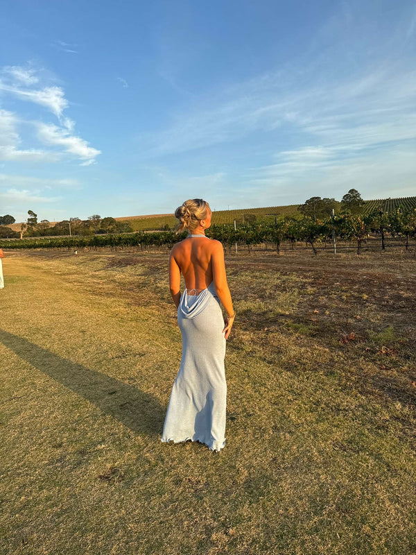 Turn heads in the Priya set—where shimmering powder blue meets an effortless style. This chic two-piece set features a slinky, stretch knit halter top with a low cowl neckline and open back, secured by an adjustable tie at the waist. Paired with the matching full length skirt for a look that's both sophisticated and classy.