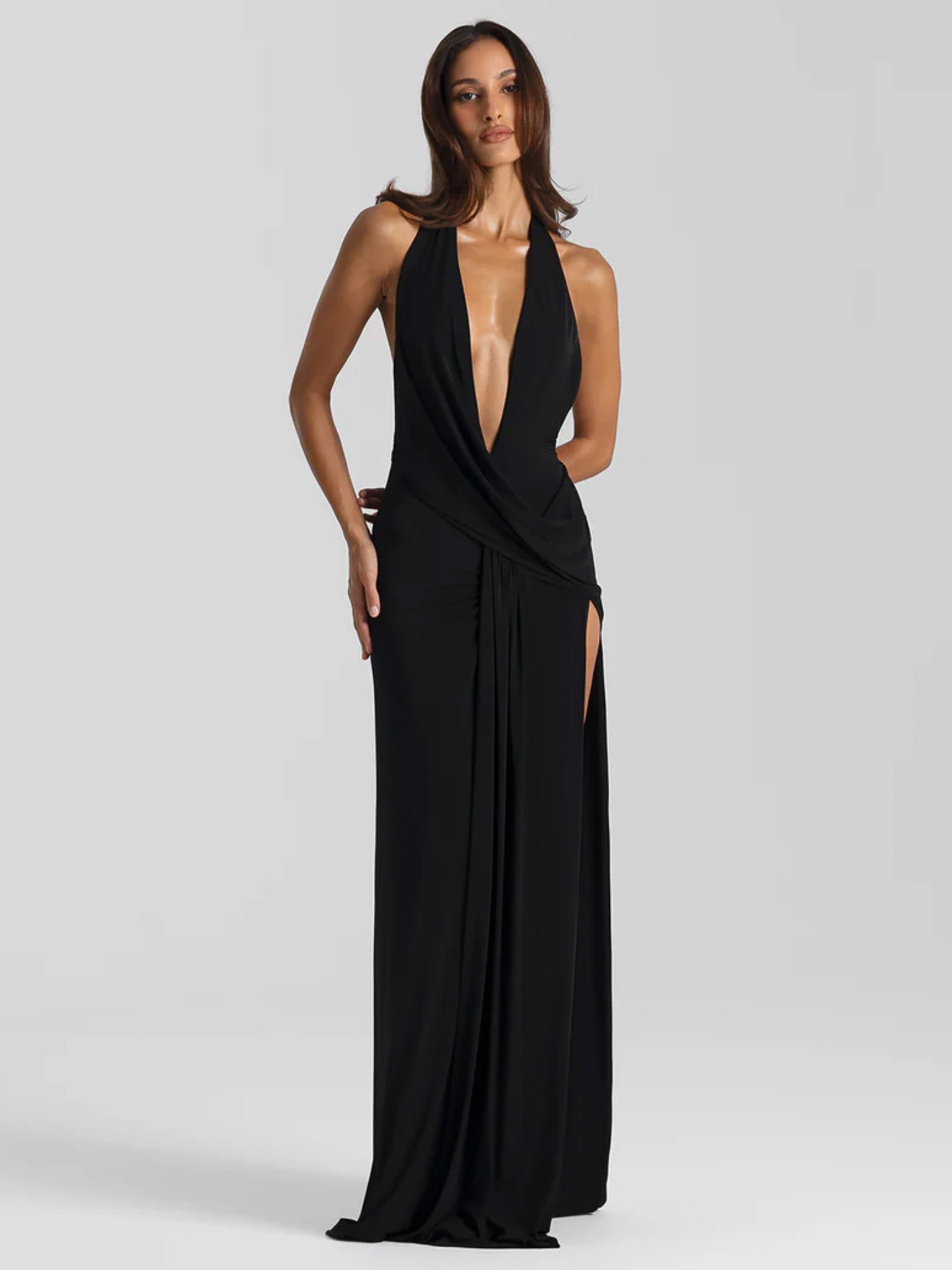 Bold, sleek, and unapologetically striking. The Winona Gown by Natalie Rolt features a deep plunge neckline, open back, and high-leg split, crafted in a soft stretch jersey that hugs in all the right places. A standout choice for formal nights and black-tie events.