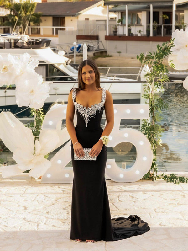 An impressive feature of glass crystals set against black provides instant stand out for this incredible gown. Intricately placed to adorn the bustline, the crystals provide next level opulence. Sleek silhouette with full mermaid train. Corseted style back for the perfect fit. A little bit lavish and a lot of drama.